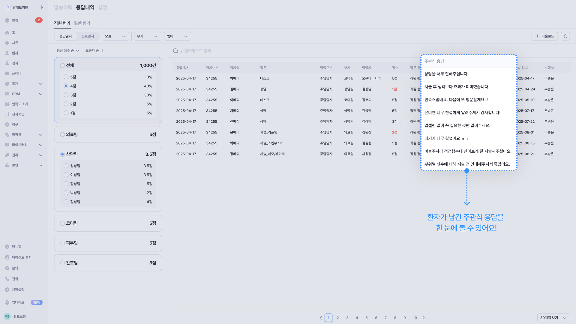 환자 만족도를 시술별, 직원별로 나누어 발송하고 분석할 수 있어요.