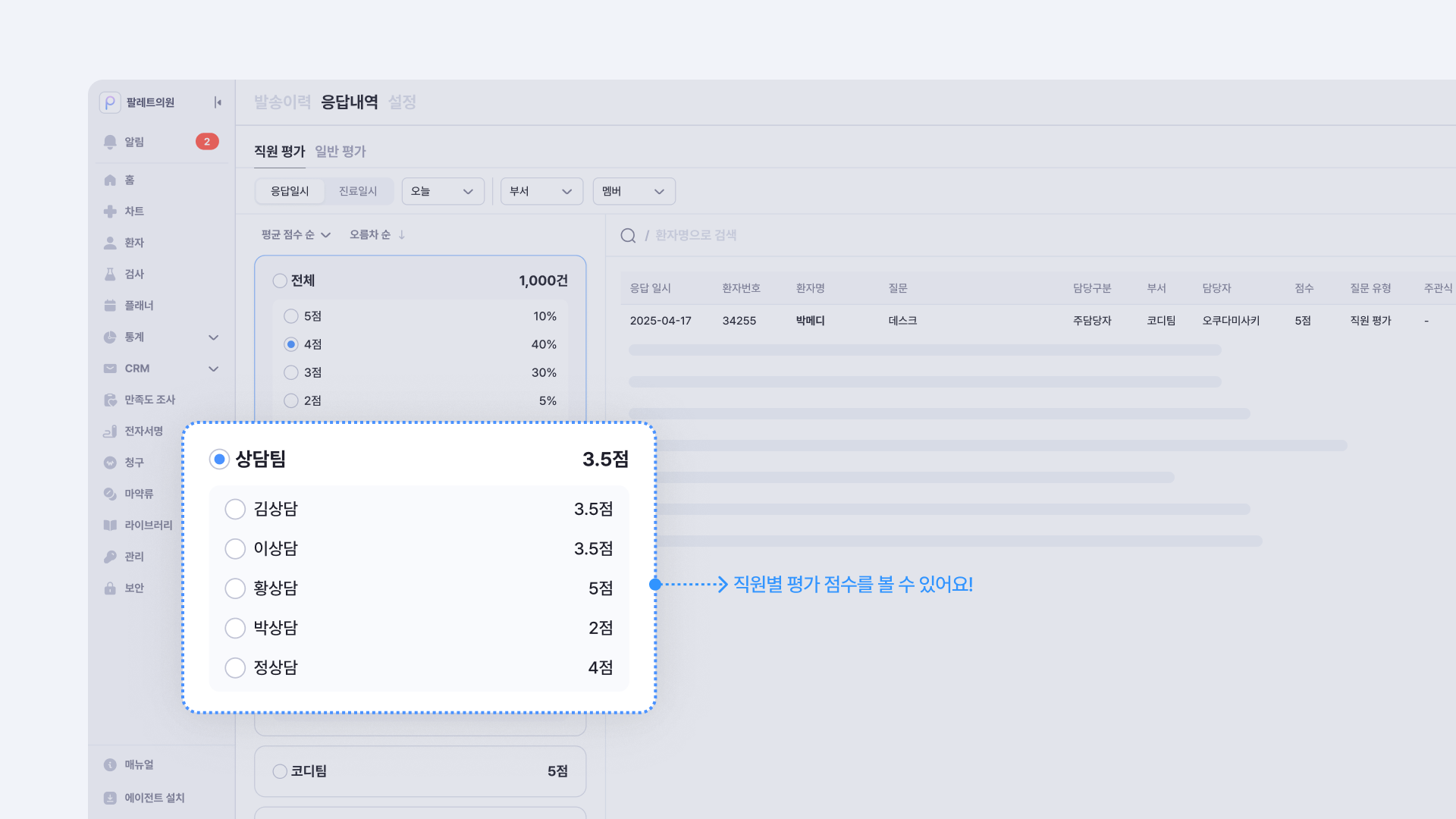 각 직원의 친절도, 응대 태도 등 환자의 실제 평가를 기반으로 원내 교육 방향이나 인센티브 관리에 참고할 수 있습니다. 이제 원내 운영 프로세스와 서비스 관리를 감으로가 아닌, 데이터로 관리하는 병원이 될 수 있어요.
